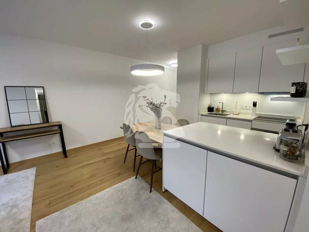 Living area with made to measure wall-cupboards. The Living room leads to a large terrace with a view on the park.