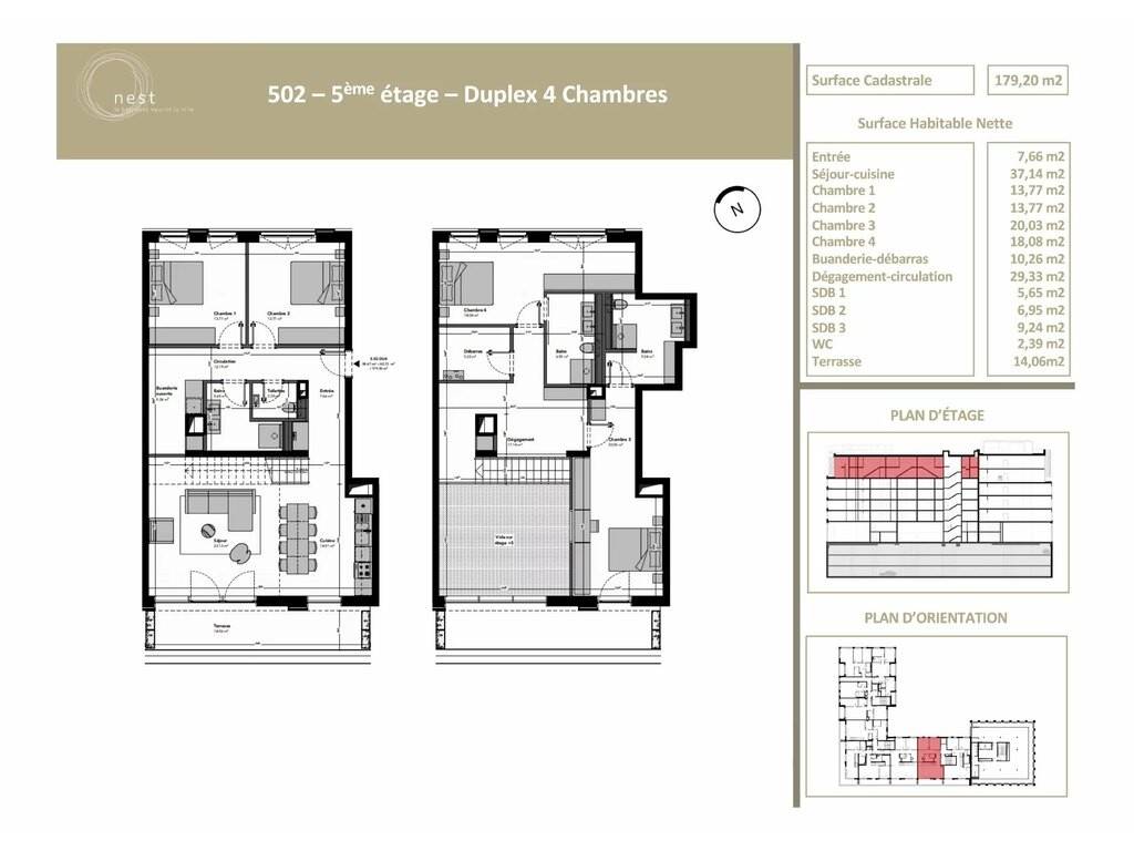 The Lot 5.02.DU4 duplex is located on the 6th and 7th floors and has a cadastral area of ±179.2m², a terrace of ±14m² and is composed as follows: