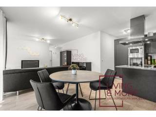 The bright living room opens onto a spacious balcony and also onto the modern, fully-equipped open-plan kitchen.
