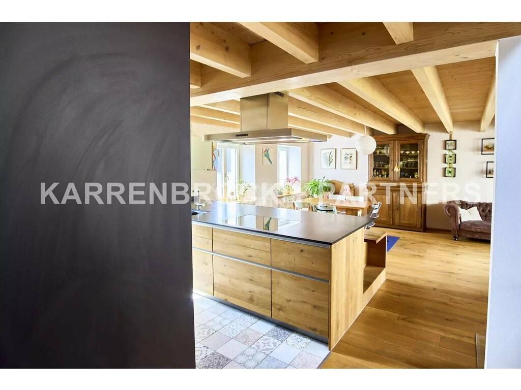 This enchanting property from 1850, which was carefully renovated in 2018, combines the charm of the past with modern living comfort. With a generous living area of 175 m², the house offers plenty of space and a bright, inviting atmosphere. The heart of the house is the open-plan living and dining area, which is directly adjacent to the kitchen. Large window fronts provide plenty of daylight and offer a seamless transition to the large terrace and the idyllic garden.