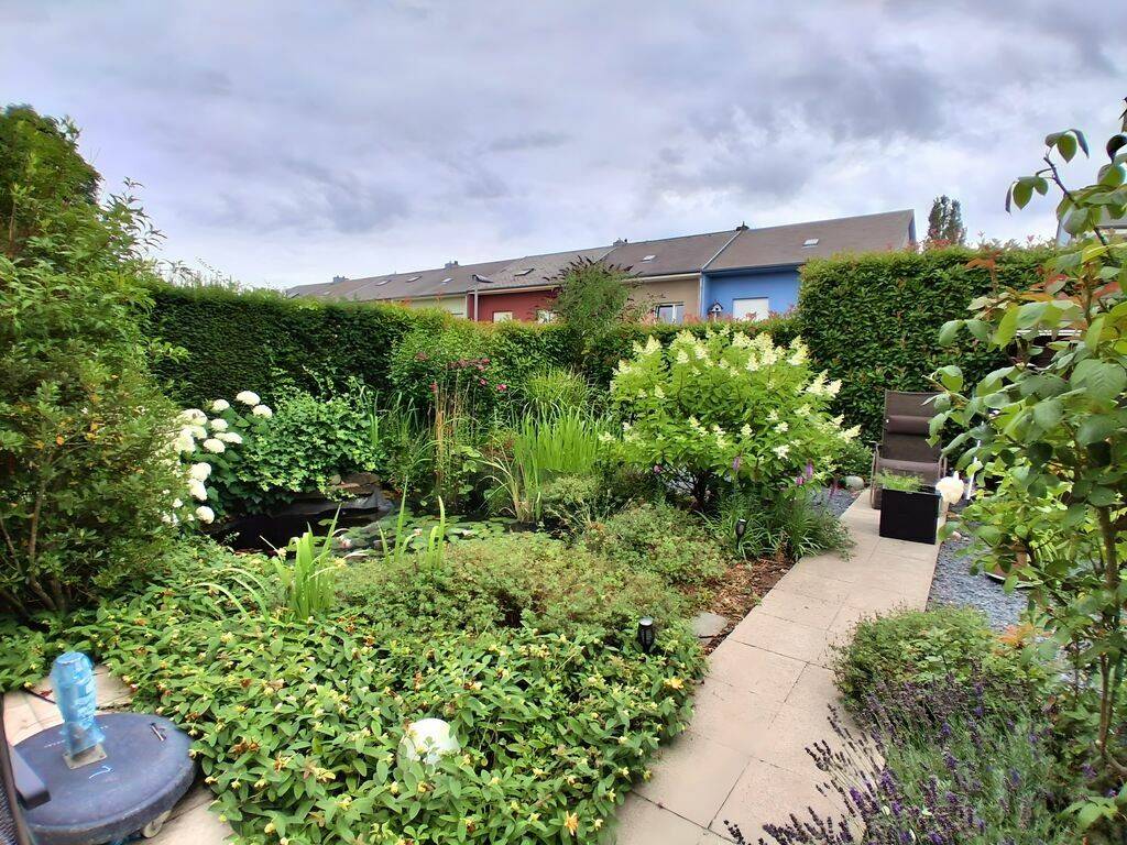 - Jardin aménagé avec bassin à poissons, abri de jardin et plantations,