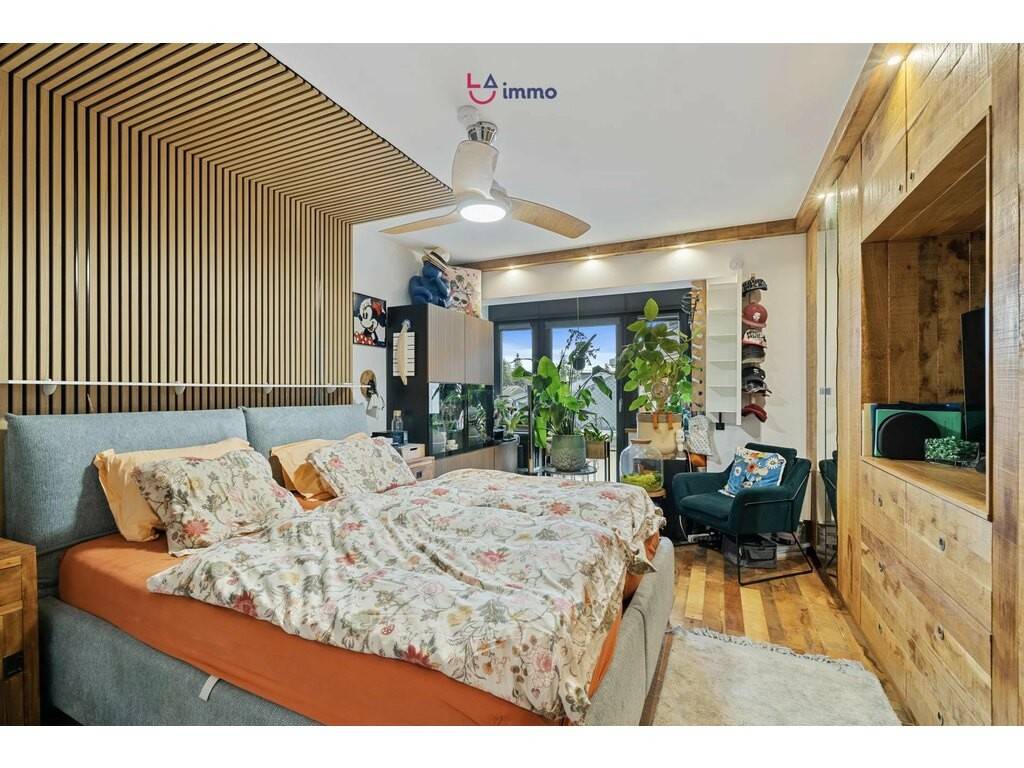 Upon entering, you will find a spacious bedroom with a custom solid wood wardrobe, providing excellent storage. The wooden parquet floors add a warm atmosphere.