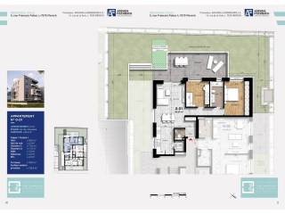 En façade principale se trouvent l'entrée pour piétons et l'accès au garage commun. La rési­dence comporte un sous-sol, un rez-de-chaus­sée et quatre étages. Au sous-sol nous retrou­vons les emplacements privatifs, les caves, les locaux communs et autres locaux techniques. Les étages et le rez-de-chaussée sont réservés à l‘habitation ou toute destination admise par les règlements administratifs afférents.