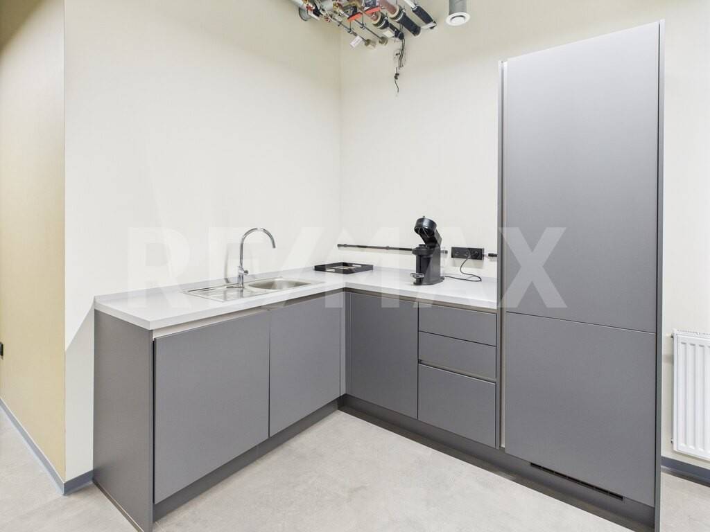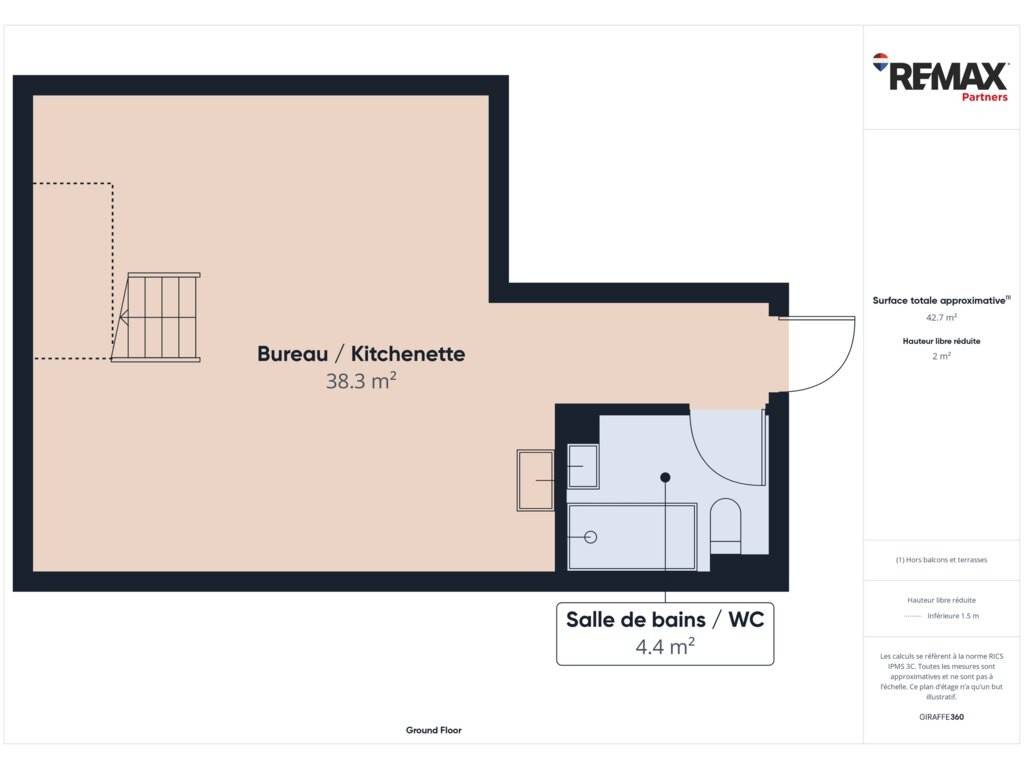 Une zone de travail de 42,32 m² avec un espace bureau, une kitchenette équipée (lave vaisselle, réfrigérateur), une salle de douche (toilettes et douche italienne).