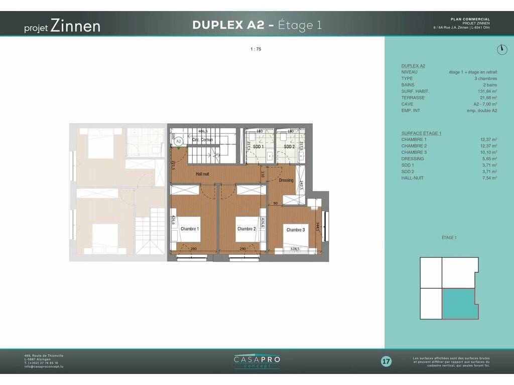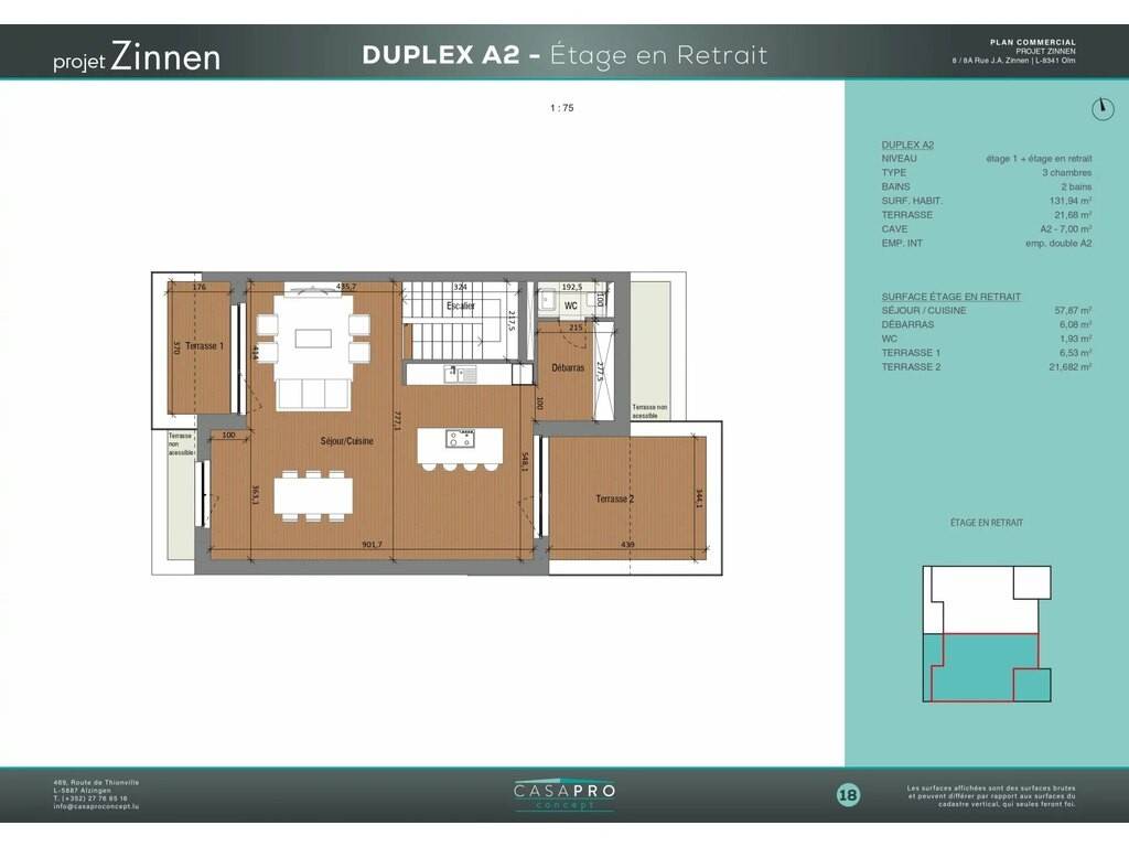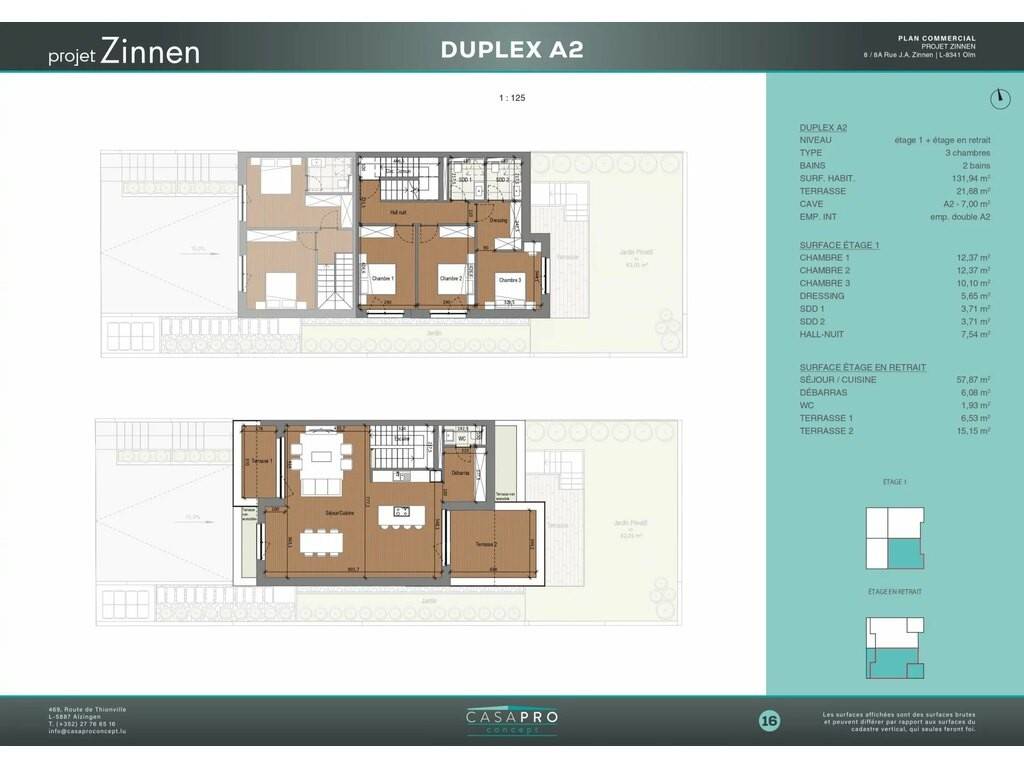 Développé sur le premier et le deuxième étage, ce duplex offre une surface habitable généreuse de 131,94 m2, pensée pour répondre aux exigences d’une clientèle recherchant volumes, luminosité et fonctionnalité. L’espace de vie principal s’ouvre sur de belles terrasses totalisant 21,62 m2, idéales pour profiter pleinement des extérieurs dans un cadre calme et résidentiel.