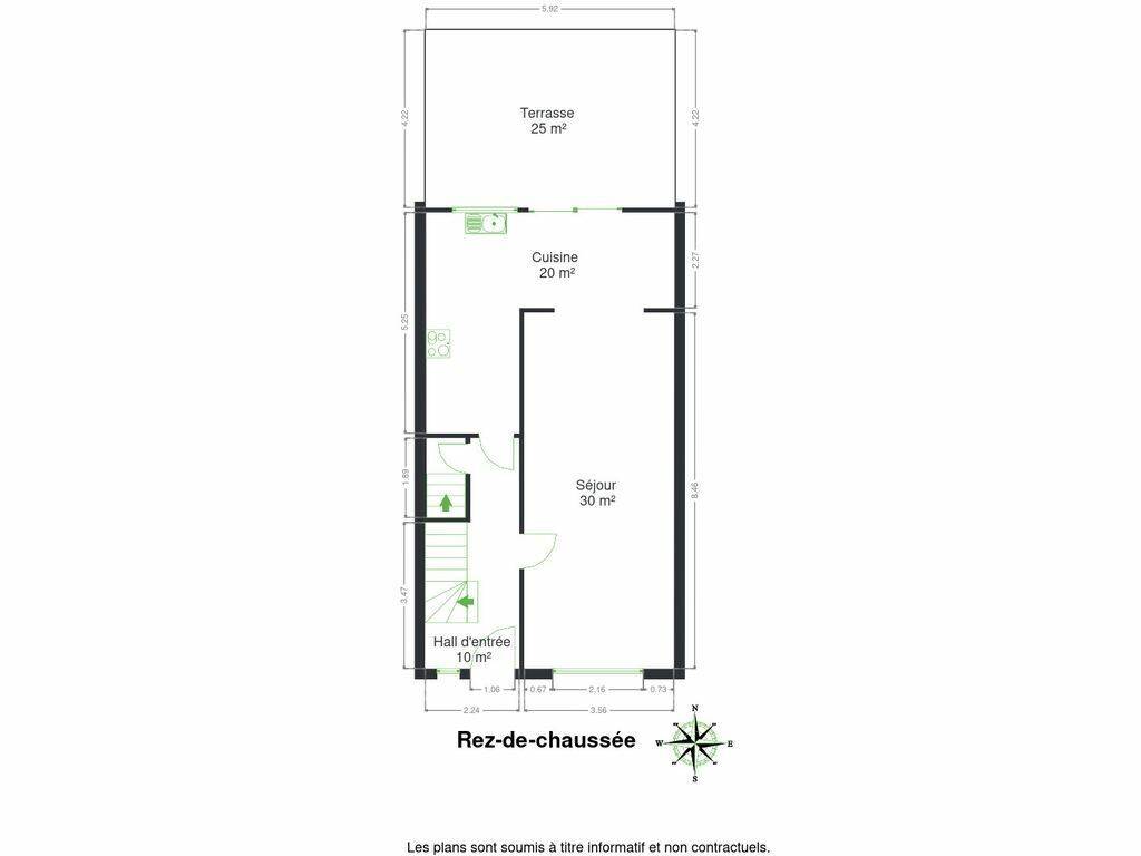 Un hall d’entrée avec rangements intégrés mène vers une toilette individuelle, puis vers un vaste espace de vie lumineux comprenant le salon, la salle à manger et la cuisine ouverte. De larges baies vitrées permettent un accès direct au jardin, apportant une belle luminosité naturelle et une agréable continuité entre intérieur et extérieur.