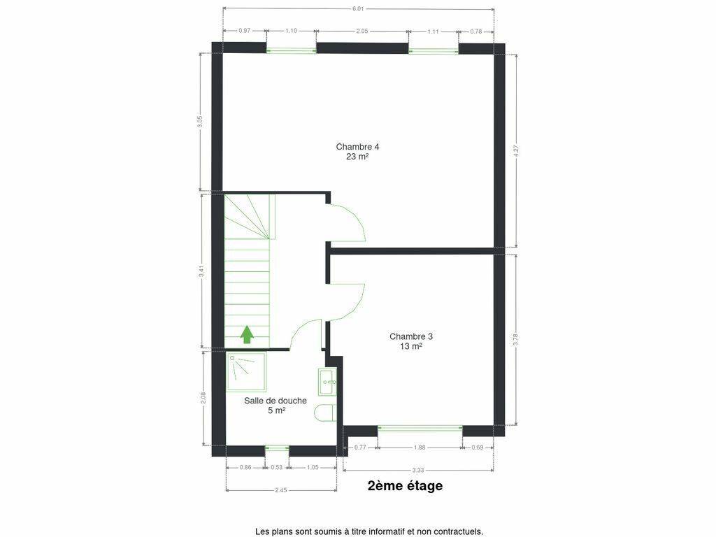 Ce niveau accueille deux chambres supplémentaires (23 m² et 13 m²) ainsi qu’une salle de douche, offrant un espace nuit parfaitement indépendant.