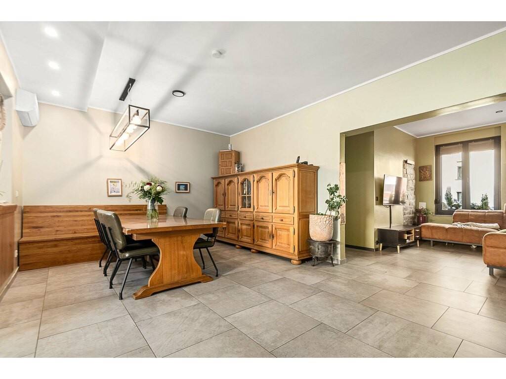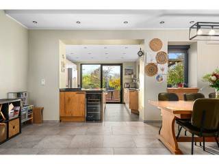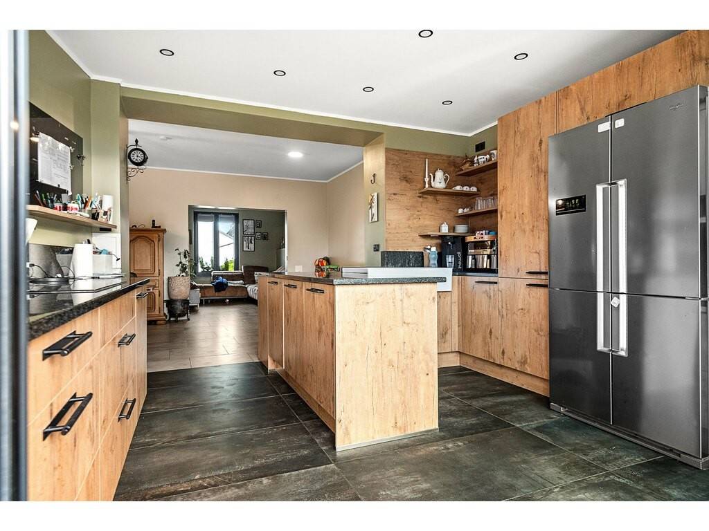 The open-plan kitchen of ±15 m², installed in the extension built in 2022, is fully and modernly equipped: central island with integrated wine fridge, ample storage and Siemens & Whirlpool appliances in excellent condition.