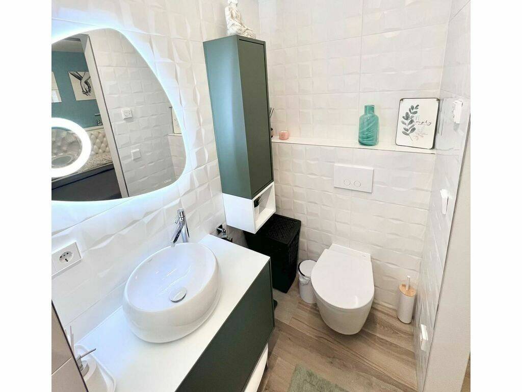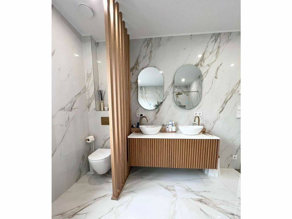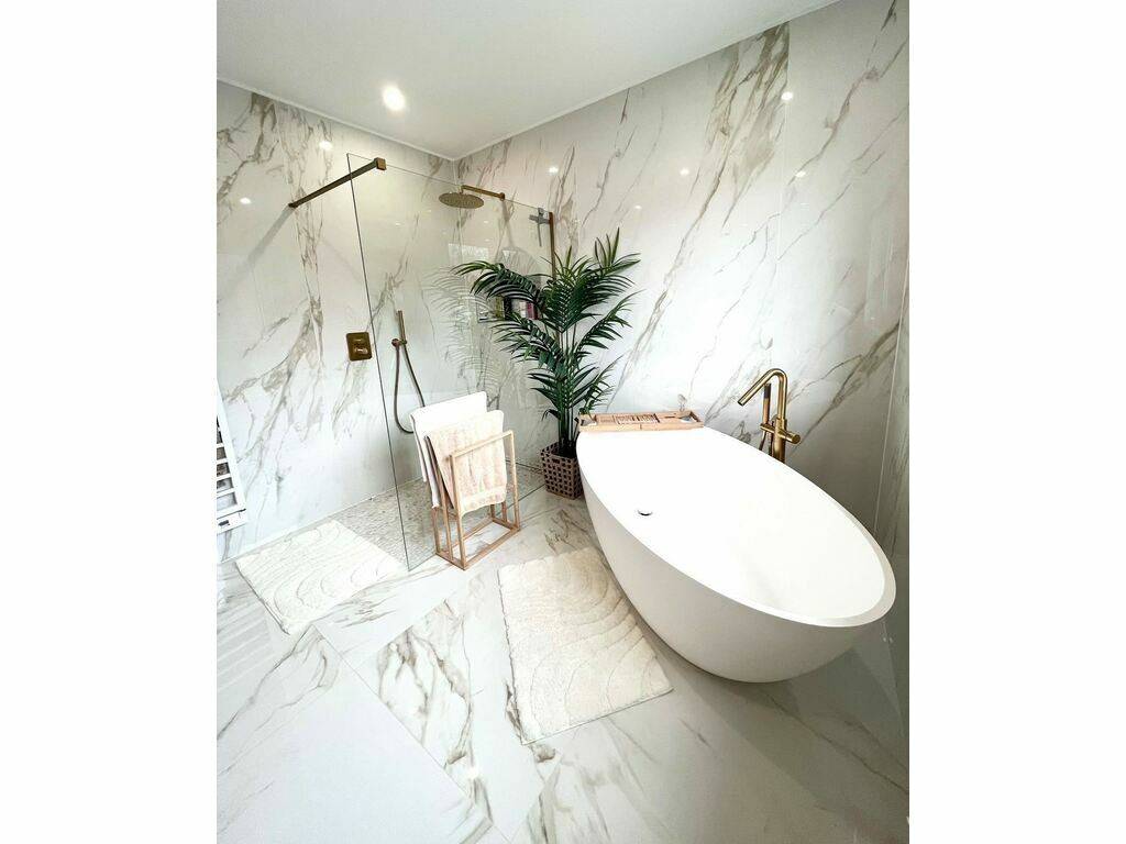 -Salle de bains et douche avec WC, double vasque, une baignoire et double douche entièrement en marbre.