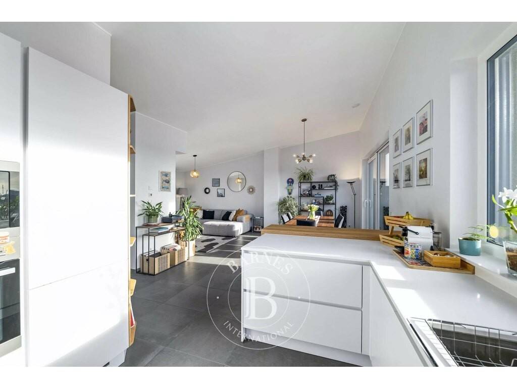 1st floor: Vast open-plan living space of approx. 62 m², comprising a bright living room with high ceilings and a fully equipped architect's kitchen with AEG appliances and adjoining storage space. Direct access to the first private terrace and one terrace of 11 m².