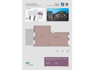 En façade principale se trouvent les entrées pour piétons et l'accès au garage commun. La résidence comporte un sous-sol, un rez-de-chaussée et quatre étages. Au sous-sol nous retrouvons les emplacements privatifs, les caves, les locaux communs et autres locaux techniques. Le rez-de-chaussée est réservé aux commerces et les étages sont réservés à l'habitation ou toute destination admise par les règlements.