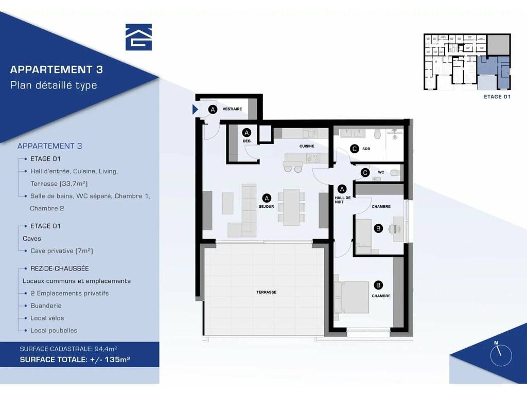 The apartment benefits from a large 33,75m2 terrace facing south and a 7,03m2 private cellar.