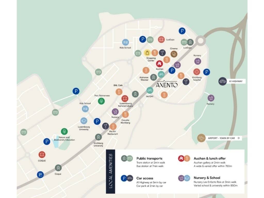 The building houses several functions, including a shopping mall with shops and restaurants on the GF of the large atrium. Offices are located on the upper floors. Ideally located on Avenue J-F Kennedy, this luxury building of 13,453 sqm, built in 2009, boasts a wide, well-oriented façade with plenty of natural light and sunlight. The building offers two addresses (Av. John F. Kennedy & Rue Marcel Fischbach) and uses modern construction technology. The office space is currently undergoing a complete renovation. Parking ratio: 1:104 m². Availability: 01.02.2026. AXENTO is centrally located in the financial district of Kirchberg in the north-east of Luxembourg City. This part of the city is characterised by various European institutions, corporations, financial service providers and educational institutions. Furthermore, there are a variety of restaurants and leisure facilities in the immediate vicinity, as well as several tram stations. Very well located on the main artery Avenue JF Kennedy close to the Auchan shopping center. - Bus Kirchberg, Lux-expo (numerous VDL lines). - Tram Kirchberg, Luxexpo (Tram Stop). - Train Dommeldange, Station: 2.2 km. - Luxembourg Airport: 3.7 km. - BREEAM IN USE EXCELLENT - PEB (B) - Active Score Platinum (soft mobility) - Air conditioning - Plain carpet - Raised floor - Restrooms - IT room - Sprinkler - Blinds - Triple glazing - Solar panels - Disabled access - Secure building access - Electric car & bike charging stations - Bike parking - Suspended ceiling with LED lighting - Modulation: 1.25 - Elevators: 7 - Clearance height: 2.70 Sale Details - Agency fees at the expense: Not communicated - Monthly charges: 6843.78 € - Deposit amount: 0.00 € - VAT charged: 17.00%