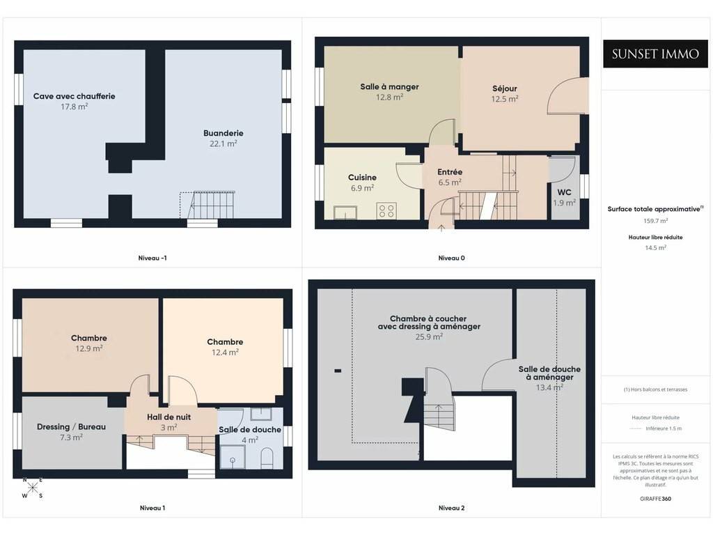 Set on a 2.80 ares plot, the house is spread over four levels (basement, ground floor, first floor and attic) and offers a total surface area of approximately ± 159.7 m², including around ± 105 m² of living space.