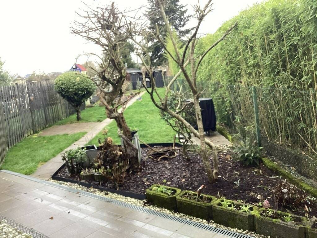 La cuisine entièrement équipée bénéficie d'un accès direct à une agréable terrasse et à un jardin soigneusement aménagé, invitant à la détente et aux moments de convivialité.