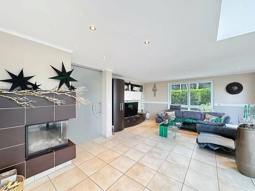 The living room, with its contemporary fireplace, creates a warm and friendly atmosphere. The wellness facilities, including sauna and whirlpool bath, add further luxury to this family home.