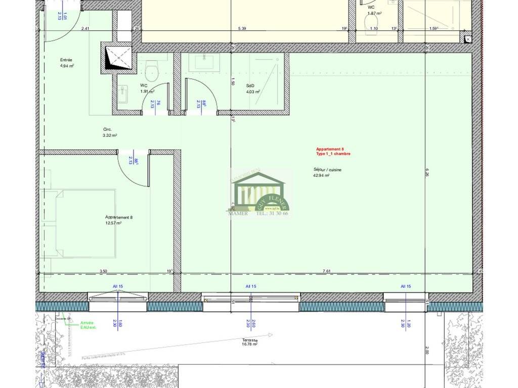 Immo Guy Flener vous présente, au sein de la Résidence Manchester à Steinfort, ce magnifique appartement situé au premier étage, offrant une surface utile de 71,49 m². Il bénéficie d'une belle terrasse privative de 16,81 m², idéalement orientée plein sud, parfaite pour profiter d'un ensoleillement optimal et d'un espace extérieur confortable.Une surface de verdure supplémentaire est aménagée sur la terrasse s'élève à 3 m². Les surfaces des terrasses sont indiquées à titre informatif et ne sont pas comprises dans la surface habitable des appartements. La surface totale vendable pondérée s'élève à 81,395m². Les caves privatives sont incluses dans le prix de vente. À titre d'exemple, l'appartement dispose d'une cave d'une surface de 5,43 m², offrant un espace de rangement pratique et fonctionnel. L'agencement raffiné comprend une chambre à coucher, une salle de bain moderne ainsi qu'un WC séparé, assurant un cadre de vie harmonieux. Le prix de vente total s'élève à 734.610,50 €, TVA à 3 % incluse.