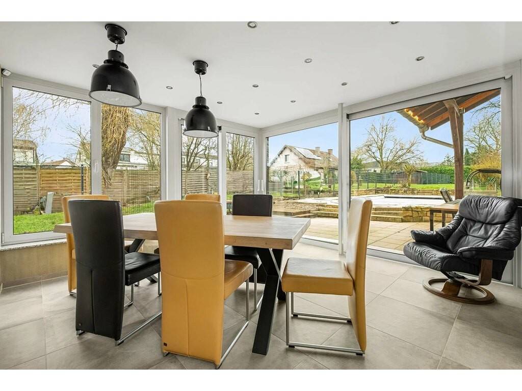 From the dining room, there is access to a bright veranda overlooking the garden and the large swimming pool — a real asset during the warmer months.