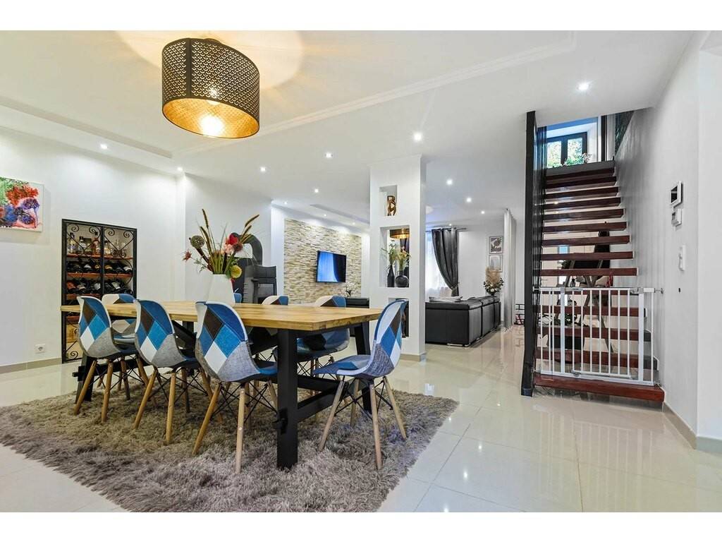 On the first floor, as you enter, you'll find a spacious 53 m² living room with a wood-burning stove, offering a warm and friendly atmosphere. This leads to a perfectly integrated 16 m² open-plan kitchen and a 17 m² study.