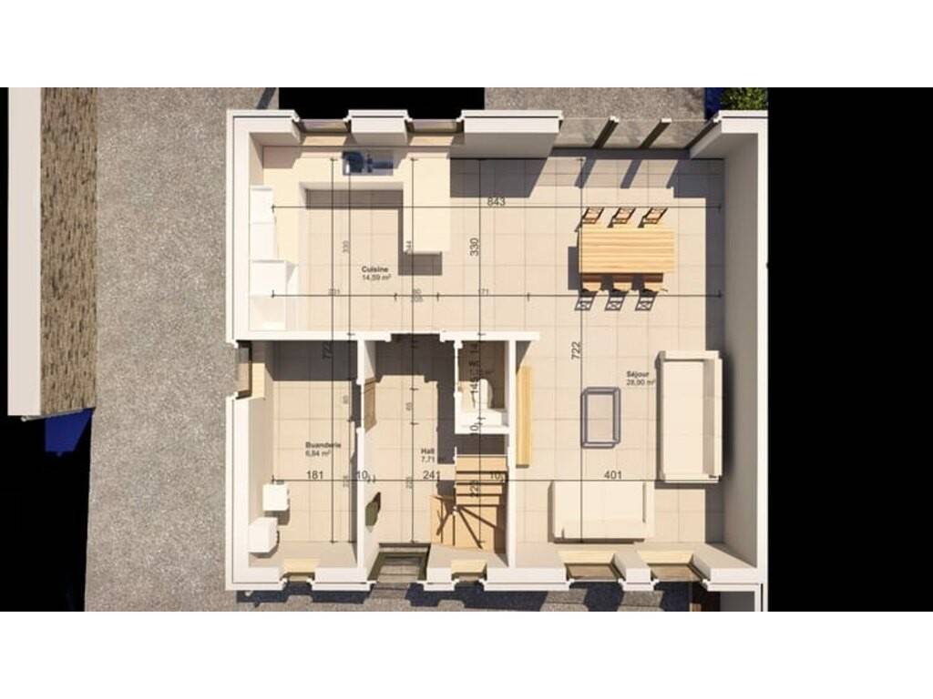 Au rez-de-chaussée : • Hall d’entrée avec WC indépendant • Séjour lumineux ouvert sur la cuisine • Cuisine • Buanderie • Terrasse • Jardin • Carport