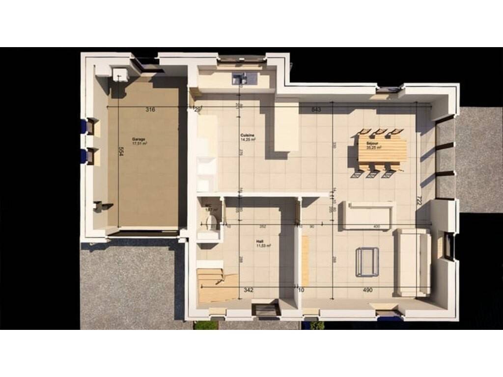 Au rez-de-chaussée : • Hall d’entrée avec WC indépendant • Séjour lumineux ouvert sur la cuisine • Cuisine • Garage / Buanderie • Terrasse • Jardin