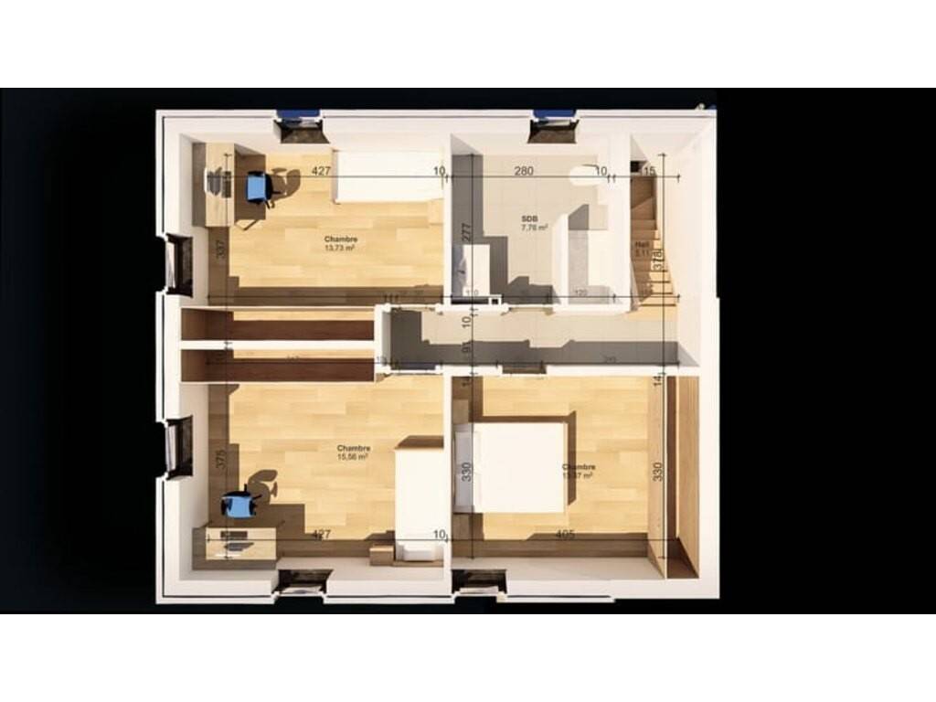 À l’étage : • 3 chambres • 1 salle d'eau avec douche, WC et lavabo