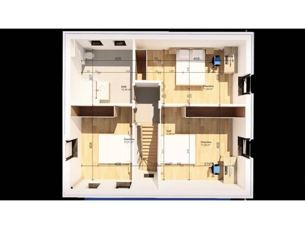 À l’étage : • Hall de nuit • 3 chambres • 1 salle d'eau avec douche, WC et lavabo