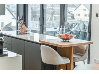 • Living Area: Light-filled living room with custom-made furniture, opening onto a magnificent 33 m² south-facing terrace with a motorized awning.