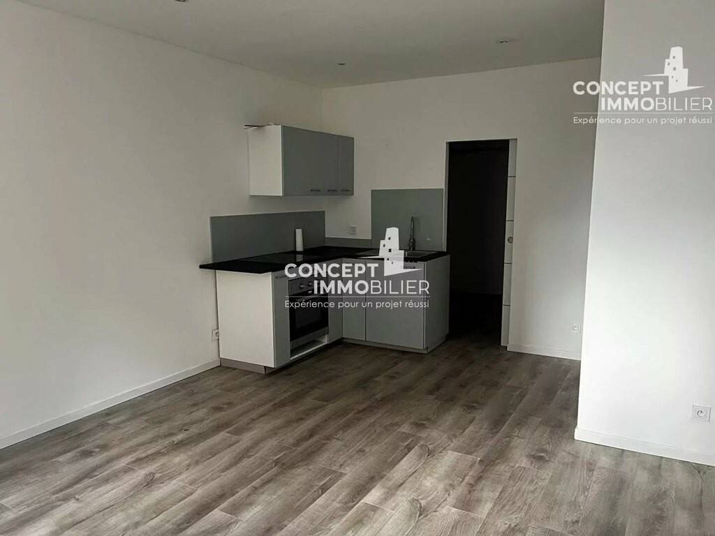 - Pièce principale avec cuisine équipée (meubles hauts, plaque de cuisson, four)