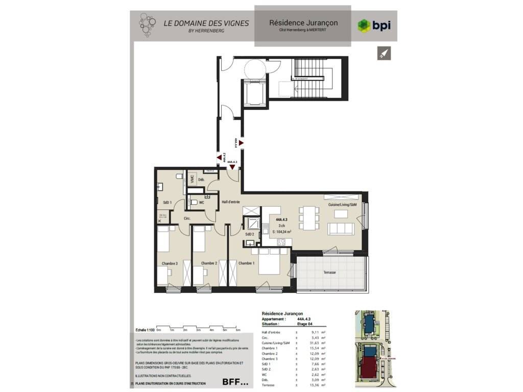 Lot 44A.4.3 – 4ème étage Appartement 3 chambres de 110 m² 1 Terrasses vues panoramique de 13 m² 1 cave incluse dans le prix 2 places de parking couvertes dédiées ( en plus du prix de vente annoncé) Classe énergétique : A TVA à 3% possible (sous conditions)