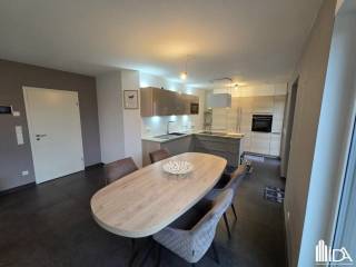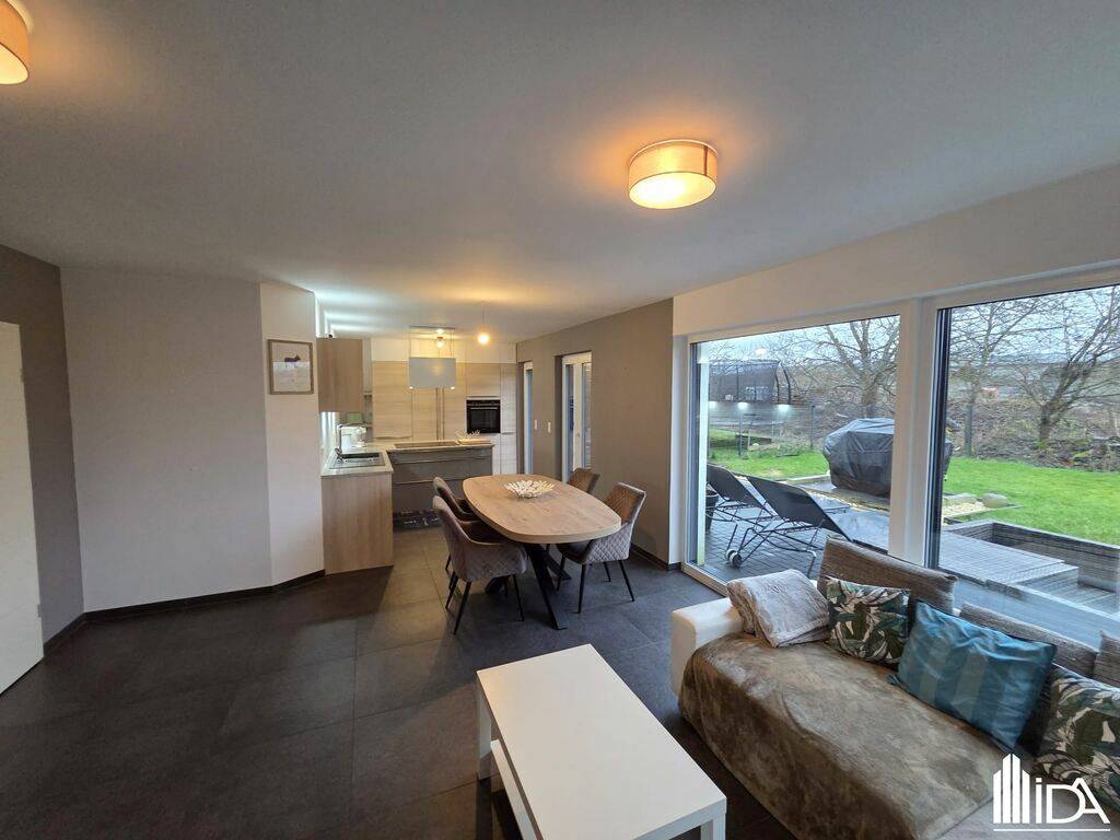 Rdch: - spacieux hall d'entrée avec armoire encastrée - wc séparé - garage 1 voiture - beau séjour / salle à manger avec coin cuisine équipée moderne et sortie sur terrasse de +/- 18m².