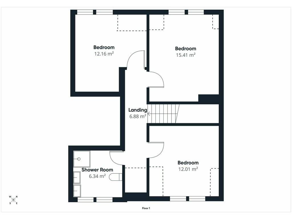 Upper floor: hall (6.9 sqm) - 3 bedrooms (12 sqm + 12.2 sqm + 15.4 sqm) - shower room (6.3 sqm)