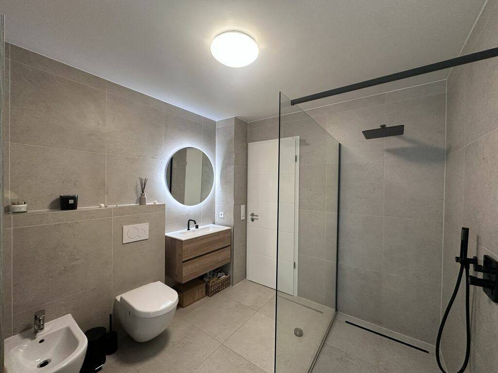 Layout of the apartment: - Entrance hall - Spacious living and dining area with direct access to the terrace (southwest-facing) - Modern, open-plan, fully equipped kitchen - One bedroom of 15 sqm - One bedroom of 14 sqm - Modern bathroom with WC, bidet, walk-in shower, and towel warmer - Separate WC - Storage room with connections for washing machine and dryer - Private cellar (3 sqm) - 1 private indoor parking space/closed garage (18 sqm) in the basement with its own door - Additional information: - Year of construction: 2008 - Fully renovated in 2021 - New high-quality, well-equipped kitchen - Security door + intercom system - Parquet flooring - Bicycle storage room - Terrace orientation: southwest