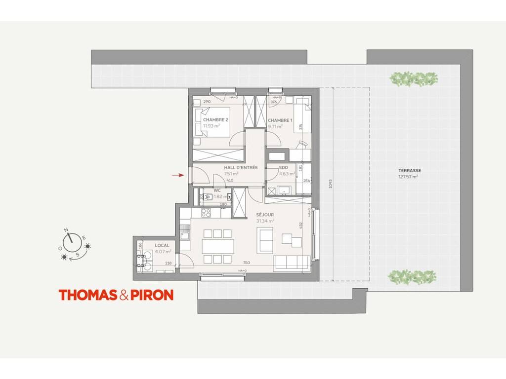 In the Mont Ruby residence, in the Hauts de Belair domain, Thomas&Piron propose you this new penthouse (MR-16) on the first floor, with a living space of 74m², including 2 bedrooms, 1 living room-kitchen, 1 shower room, 1 separate toilet and 1 terrace of 127.57 m².