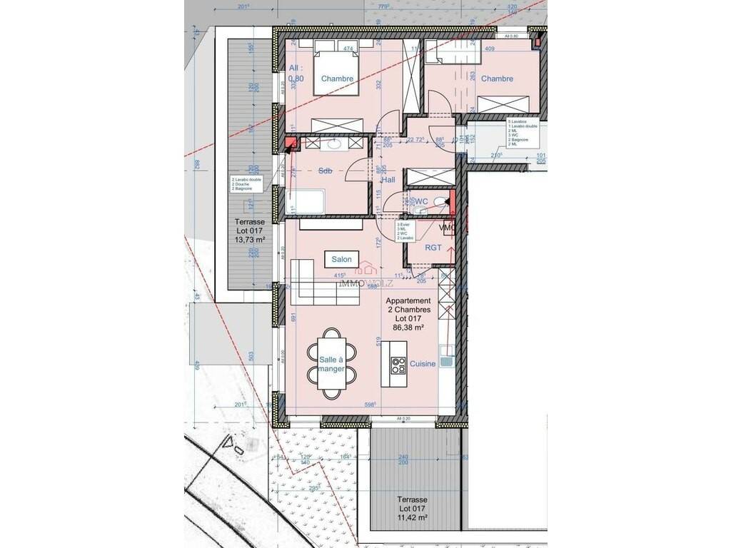 Entrance hall Separate WC Living-dining room with open kitchen 2 bedrooms Shower room (vanity unit, shower) Storage room with washing machine and dryer.
