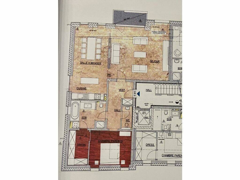 * A double bathroom, with its laundry area, its toilets, shower, bathtub, sink, a second WC, and its towel radiator. Direct access to the dressing room and from the dressing room to the bedroom.