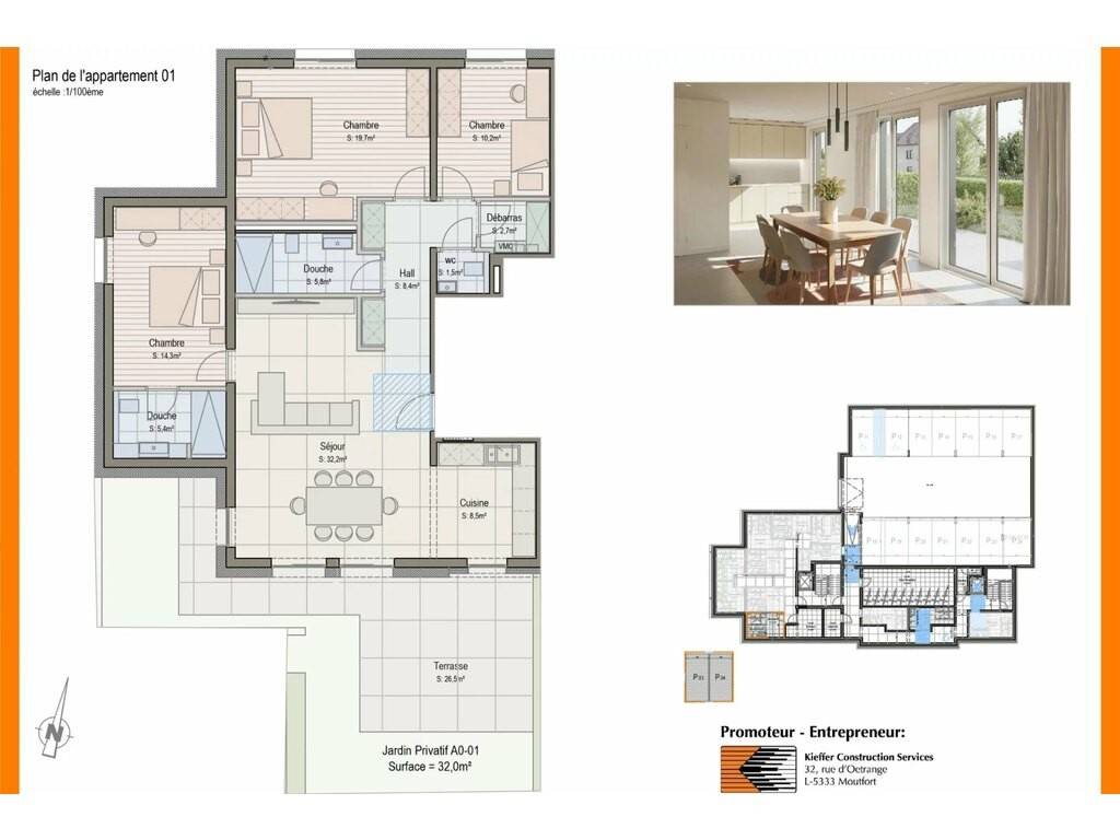 The outdoor areas include a large terrace of approximately 26.5 sqm as well as a private garden of approximately 32 sqm, ideal for enjoying sunny days in complete privacy.
