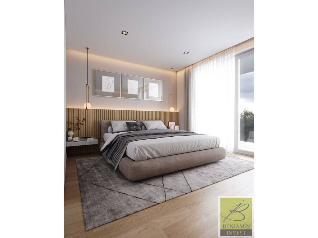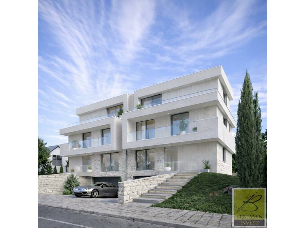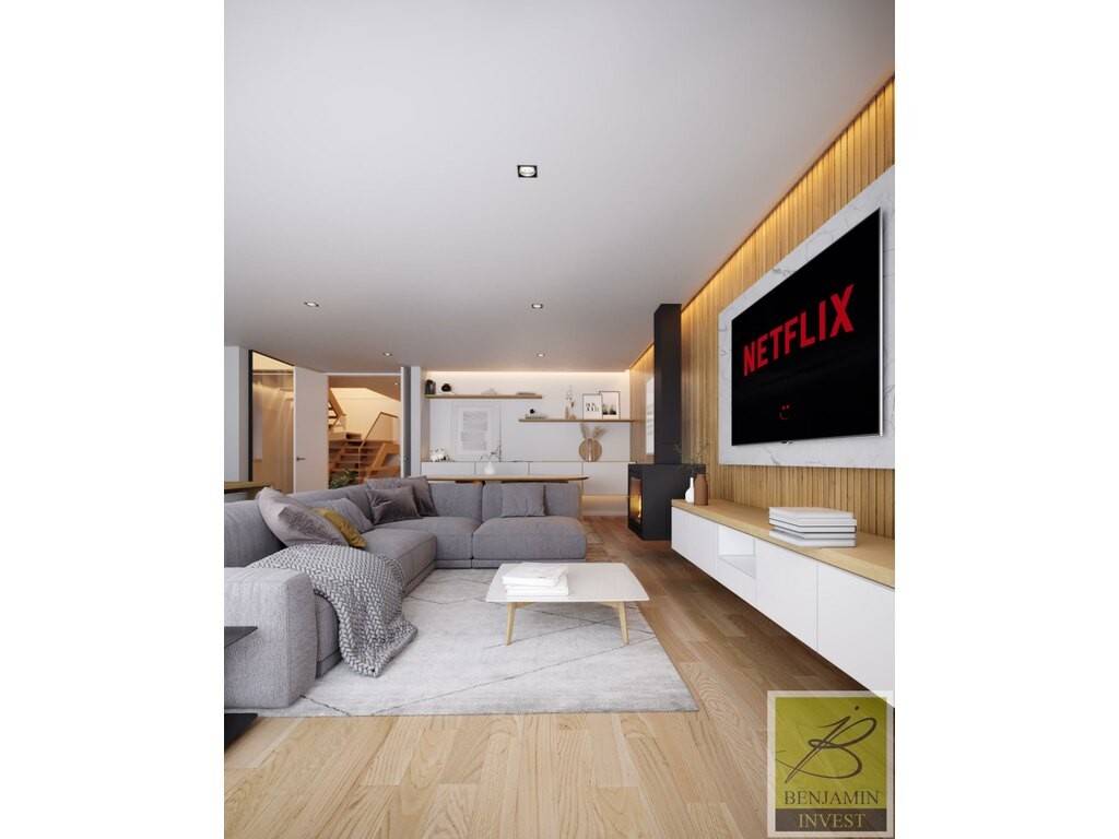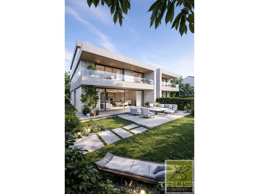 Exceptional ground-floor apartment – high-end amenities – 20 m² terrace – private garden ± 76 m² – panoramic views over the fields. Located on the ground floor of an elegant semi-detached house, this apartment offers generous living spaces, natural light, and cutting-edge technology, providing a privileged living environment in a green and peaceful setting with unobstructed views of the surrounding fields. It comprises the following: an entrance hall, a spacious foyer, and an open-plan living area of ± 52 m², where the living room and dining room open onto the kitchen, creating a welcoming space. The property offers direct access to a superb 20 m² south-facing terrace and a private garden of approximately 76 m². It features two bedrooms of approximately 12 m² each, each with its own shower room and WC, and a separate guest WC. An ideal layout guarantees comfort, privacy, and functionality. Additional features include a basement, a private 5.3 m² cellar, a shared laundry room, a rubbish room, an indoor parking space for one car (€48,500), and a lift serving all levels. Outside, there is a private garden of approximately 76 m² and an additional outdoor parking space in front of the garage. High-end amenities and equipment include a lift, a state-of-the-art heat pump, solar thermal panels, underfloor heating, a double-flow mechanical ventilation system, and windows. Triple-glazed acoustic and thermal aluminum-wood windows (Schüco or similar)