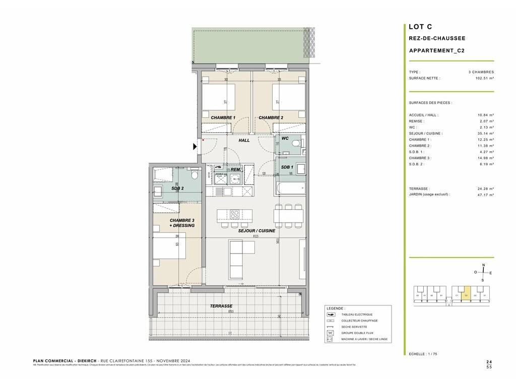-two bedrooms (11.38 and 12.25 m2) with garden access (47.17 m2)