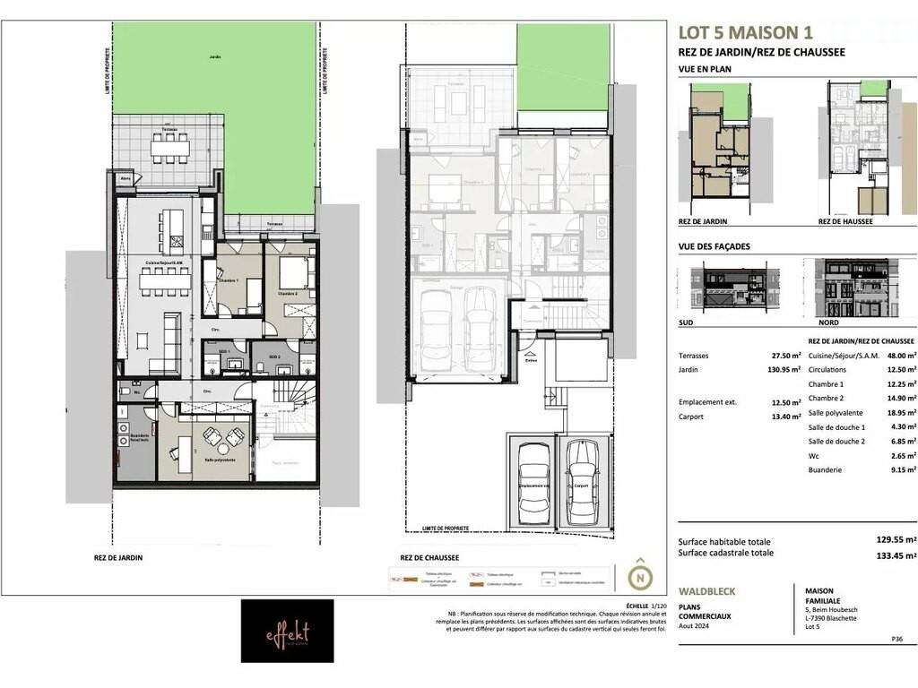 - A distribution hall - 48.00 m² living room with open-plan kitchen - Access to the 22.00 m² terrace and 130.95 m² garden. - Master bedroom with shower room and access to terrace - A 12.25 m² bedroom with access to a 4 m² balcony - An 18.95 m² multi-purpose area (office, cinema room, gym, dressing room or temporary sleeping area, etc.). - A shower room - Separate WC - Laundry and technical room with possibility of under-slope cupboards
