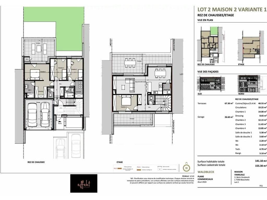 First floor: - entrance hall - mailbox - garbage can area - garage - laundry and technical room - two attractive bedrooms of 11.65 m2 and 12.15 m2 - shower room - separate toilet - a 22.65 m2 master bedroom (with dressing room) with private shower room (with WC) and terrace access