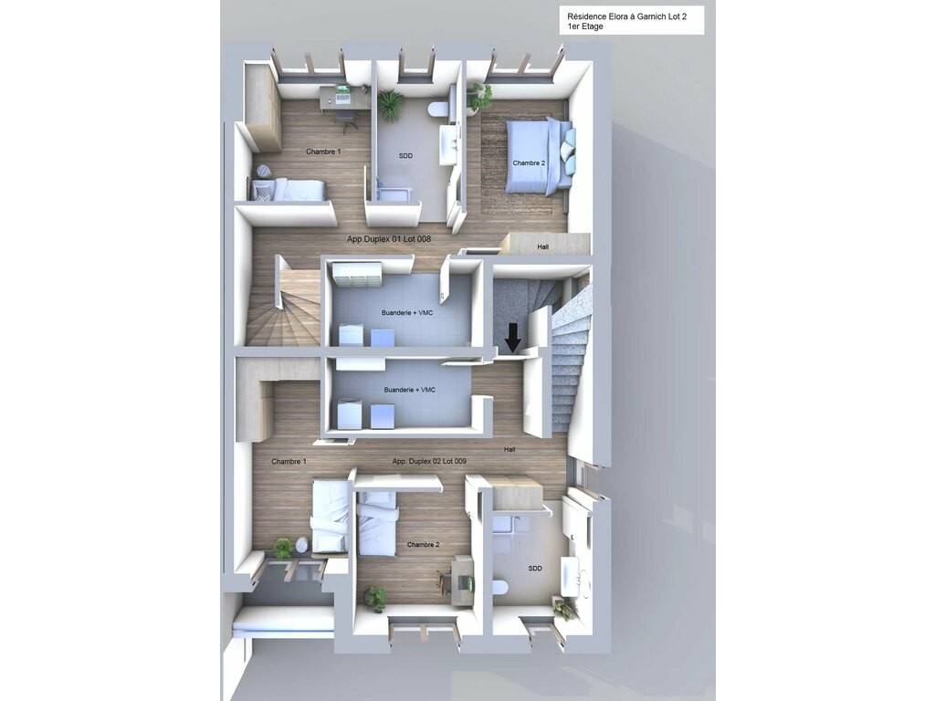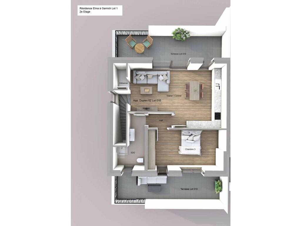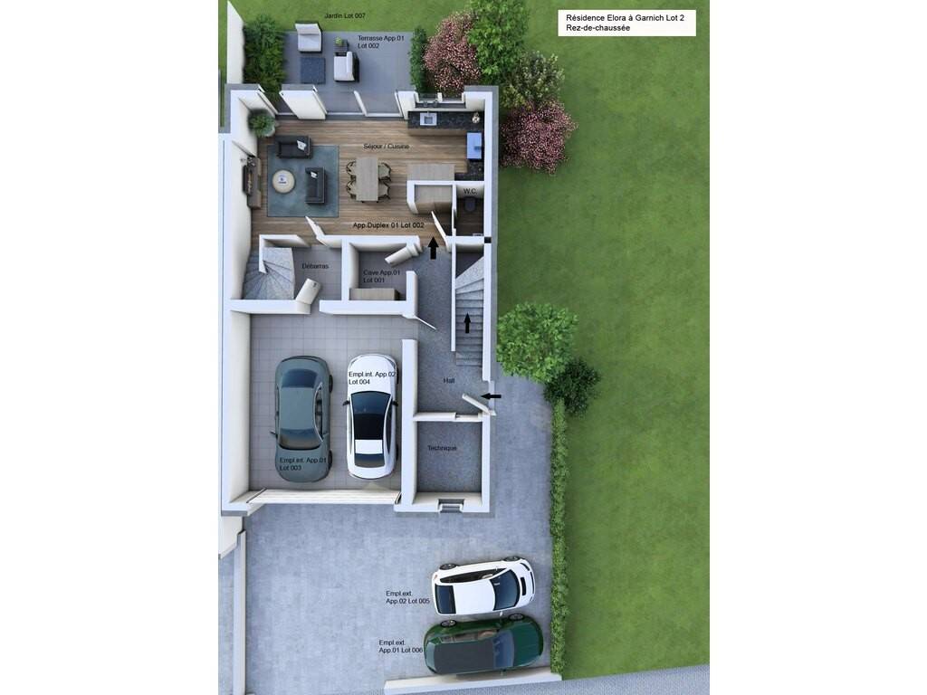 The real estate agency HOME INVEST offers you exclusively a duplex apartment (lots 002+008), with a living area of 100.82 sqm, situated on the ground and the 1st floor, which is arranged as follows: From the ground floor entrance, you have direct access to: - a separate WC of 1.80 sqm - a bright living room/kitchen of 38.58 sqm, which opens onto a beautiful terrace of 16.50 sqm as well as a private garden of 273.45 sqm A staircase/storage area of 5.88 sqm leads to the 1st floor, which comprises: - a hallway of 6.65 sqm - a laundry/technical room of 8.29 sqm - a shower room with window of 7.23 sqm, including a washbasin, wall-mounted WC, and shower - a first bedroom of 14.76 sqm - a second bedroom of 11.58 sqm. On the ground floor, you also benefit from a private cellar (Lot 001), an indoor parking space (Lot 003), and an outdoor parking space (Lot 006). This parking package is offered at an additional price of 60.000.- EUR excluding VAT. The displayed price is excluding VAT on the construction portion to be completed. The land portion is VAT exempt. The price including 3% VAT amounts to EUR 787.240 (subject to acceptance by the Land Registration and Estates Department and in accordance with the provisions of the Grand Ducal Regulation of July 30, 2002). The agency fees are payable by the seller(s). 10 YEAR STRUCTURAL WARRANTY. Sale Details - Agency fees at the expense: Not communicated - Thermal protection class: B