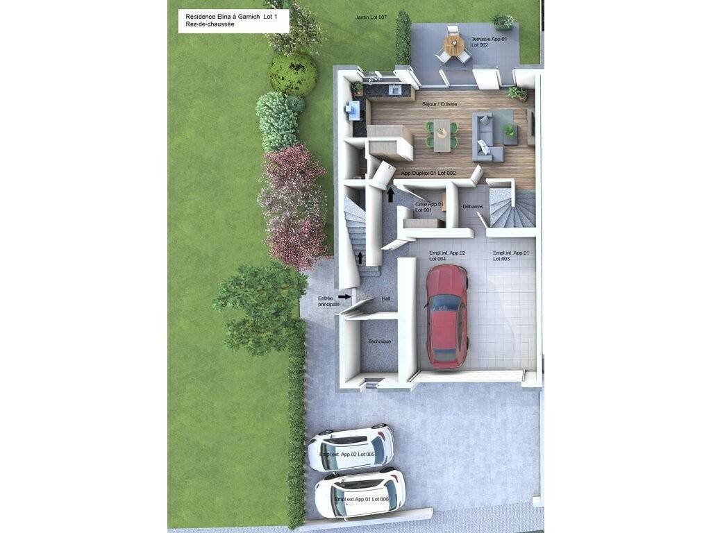 The real estate agency HOME INVEST offers you exclusively a duplex apartment (lots 002+008), with a living area of 100.16 sqm, situated on the ground and the 1st floor, which is arranged as follows: From the ground floor entrance, you have direct access to: - a separate WC of 1.80 sqm - a bright living room/kitchen of 38.58 sqm, which opens onto a beautiful terrace of 16.50 sqm as well as a private garden of 264.55 sqm A staircase/storage area of 5.88 sqm leads to the 1st floor, which comprises: - a hallway of 6.65 sqm - a laundry/technical room of 8.29 sqm - a shower room with window of 7.23 sqm, including a washbasin, wall-mounted WC, and shower - a first bedroom of 11.58 sqm - a second bedroom of 14.76 sqm. On the ground floor, you also benefit from a private cellar (Lot 001), an indoor parking space (Lot 003), and an outdoor parking space (Lot 006). This parking package is offered at an additional price of 60.000.- EUR excluding VAT. The displayed price is excluding VAT on the construction portion to be completed. The land portion is VAT exempt. The price including 3% VAT amounts to EUR 787.423 (subject to acceptance by the Land Registration and Estates Department and in accordance with the provisions of the Grand Ducal Regulation of July 30, 2002). The agency fees are payable by the seller(s). 10 YEAR STRUCTURAL WARRANTY. Sale Details - Agency fees at the expense: Not communicated - Thermal protection class: B