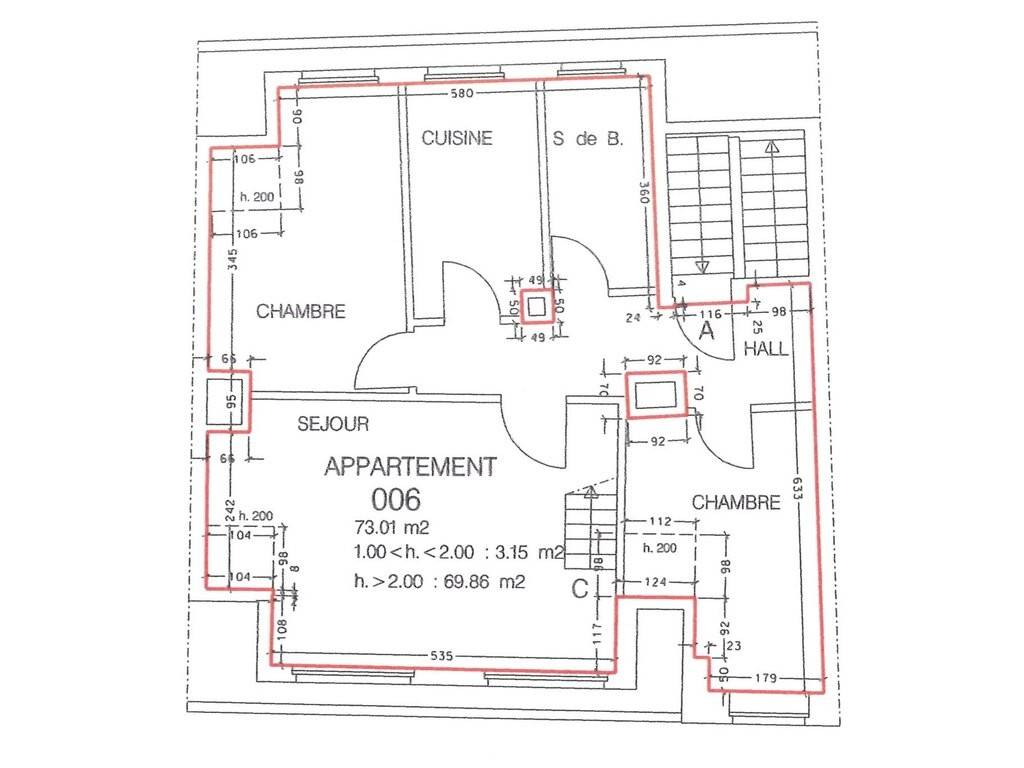 L'appartement se compose comme suit: - Hall d'entrée-couloir (7.5 m²) - Séjour avec parquet au sol (24 m²) avec escaliers en bois vers Mezzanine - Mezzanine de 47.35 m² avec 13.2 m² utilisables plus de 2 m² et au sol 34 m² en dessous de 2 m - Cuisine séparée récente entièrement équipée (7.2 m²) - 2 chambres à coucher avec parquet au sol ( 12 m² + 10 m²) - Salle de bains avec baignoire et WC suspendu (5.6 m²) - Cave privative au sous-sol -1 - 1 emplacement privatif pour voiture (18 m²) dans grand garage avec accès par grande porte sectionnelle