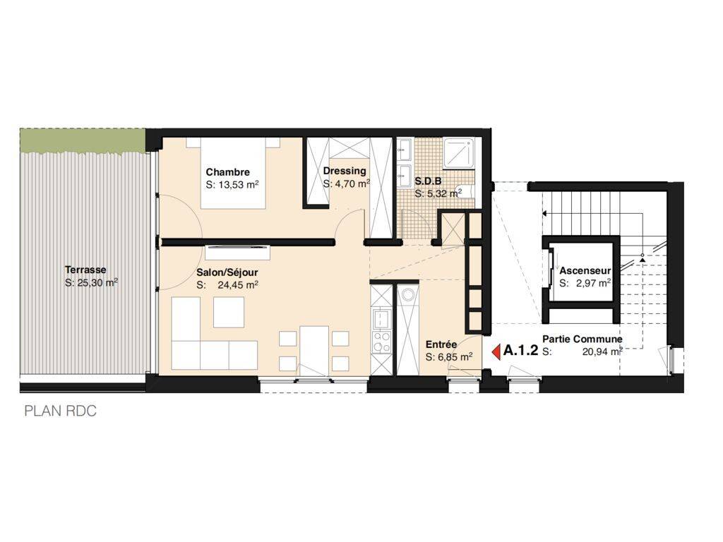 For sale, a beautiful ground floor apartment with a living area of 55m² and a lovely 26m² terrace, in future state of completion (Lot R1.A.1.2) with an A energy rating, built on the new housing development in the heart of Junglinster.