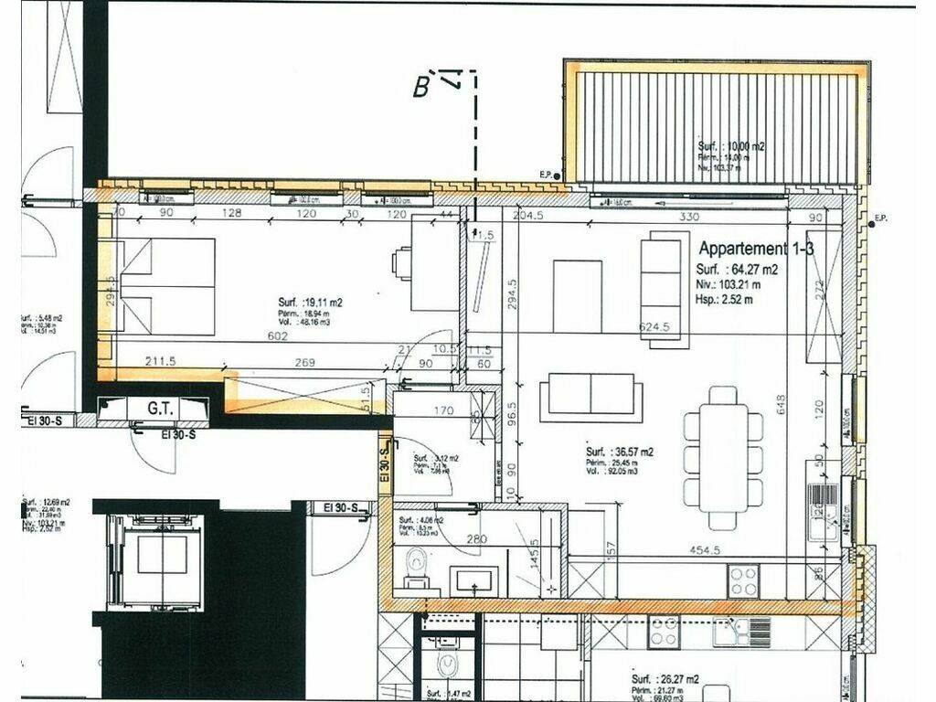Appartement d'une surface d'environ 64 m² au premier étage avec ascenseur, 1 chambre, terrasse