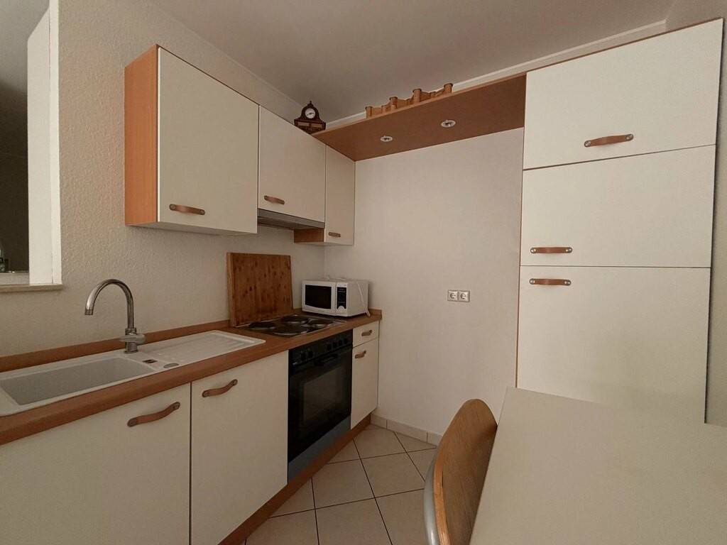 What: small, partially furnished studio apartment, approx. 32 m2, located on the 2nd floor of a residence near the center of Mondorf-les-Bains, consisting of :