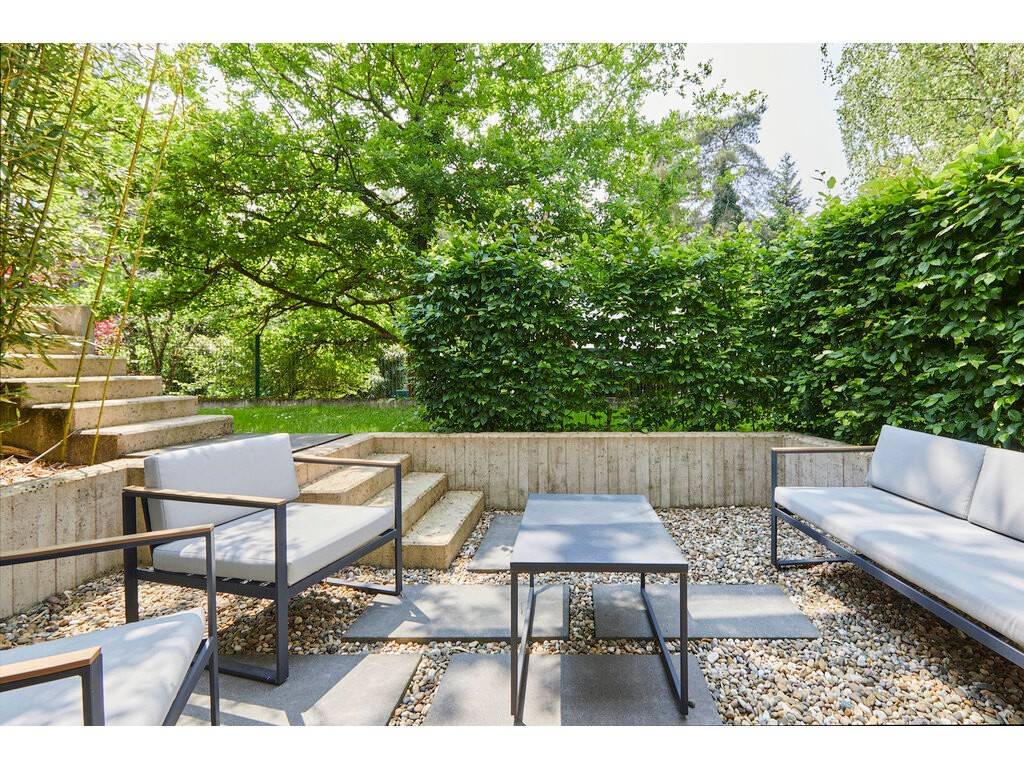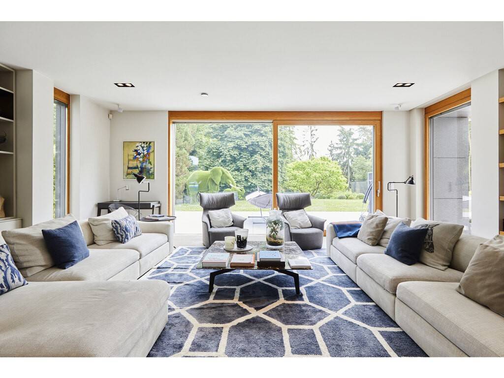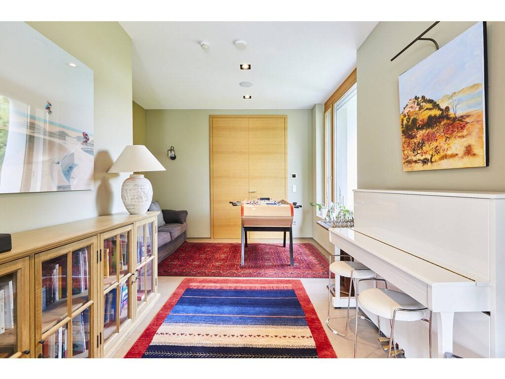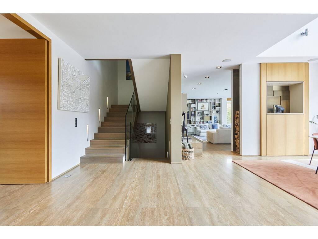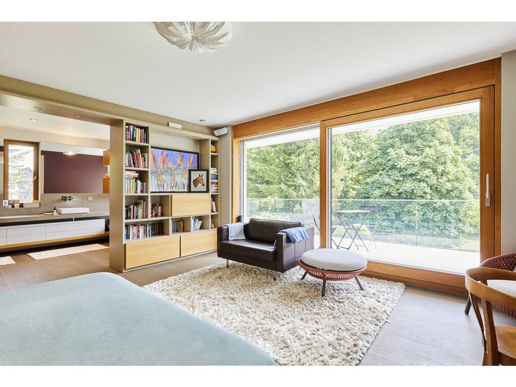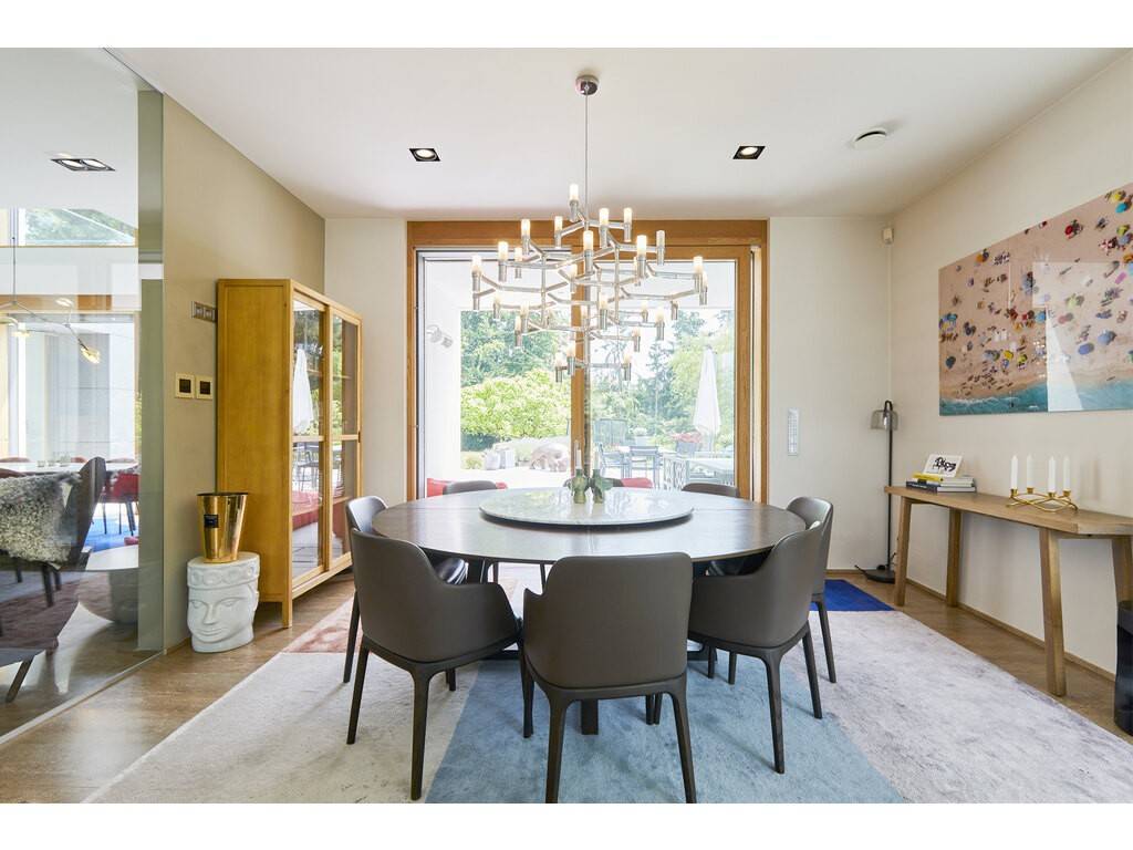 The ground floor opens onto a spacious entrance hall leading to a dining room flooded with natural light, thanks to large floor-to-ceiling windows and double-height ceilings. The Varenna kitchen is complemented by a second dining area. A covered terrace with a storage room offers an unobstructed view of the beautifully landscaped, south-facing garden. A large living room, library, office, cloakroom, and guest WC complete this level.