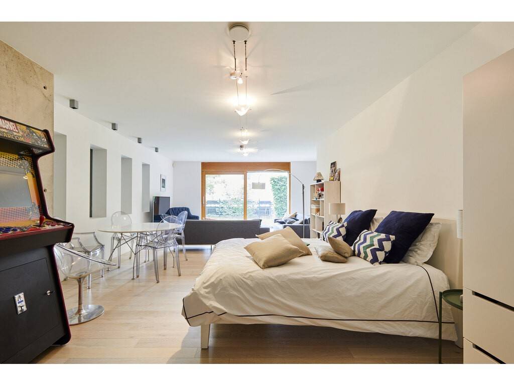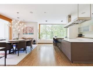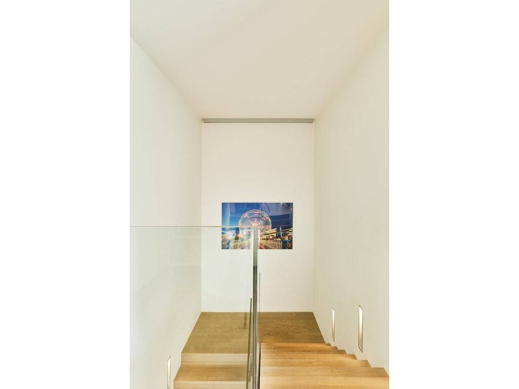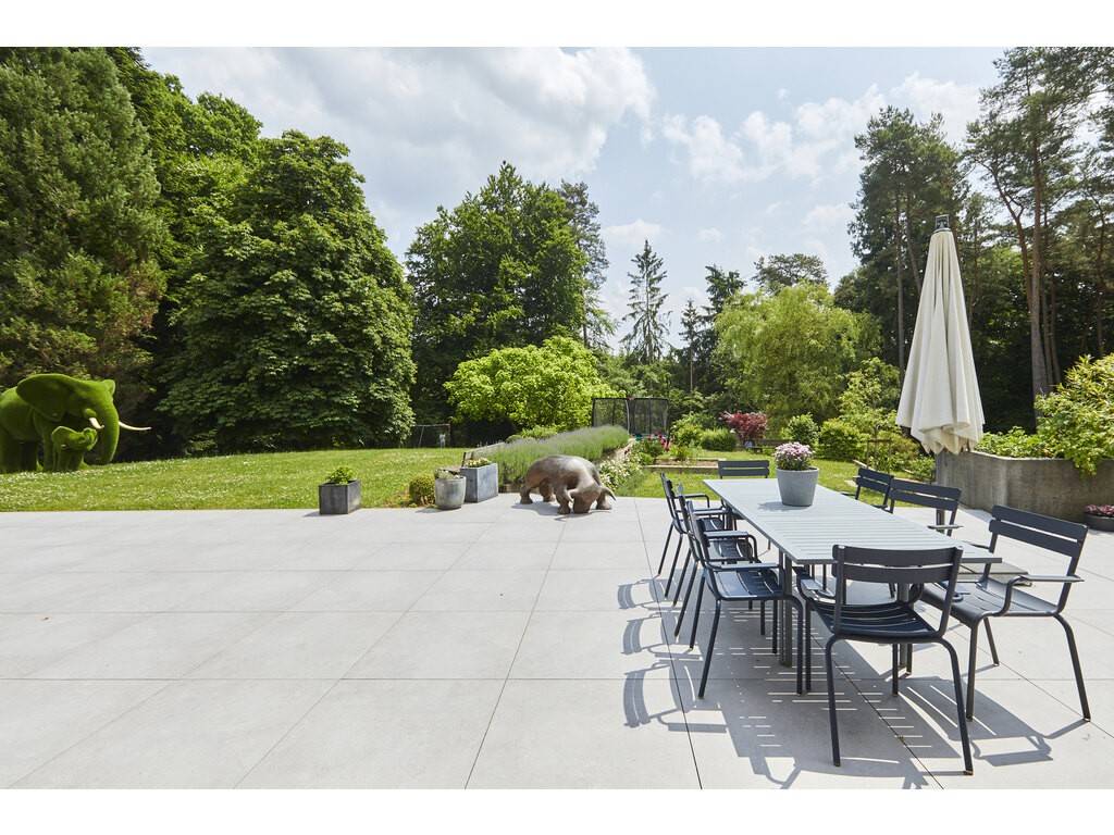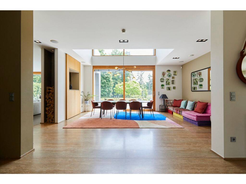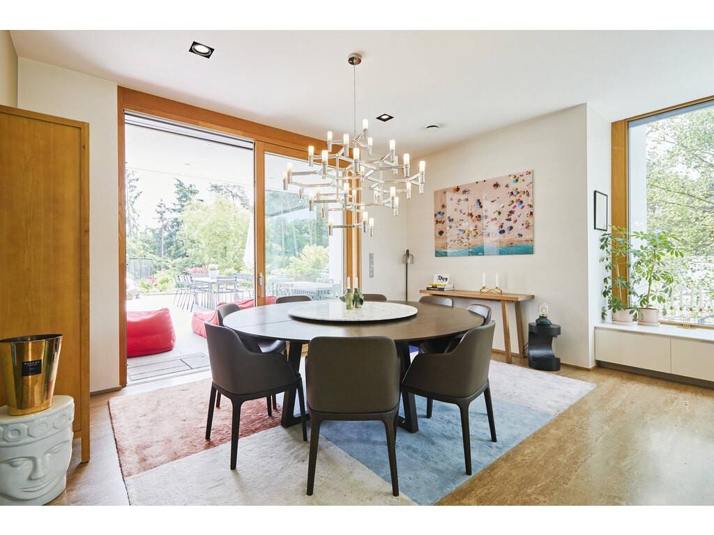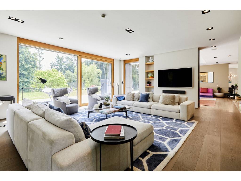 The ground floor opens onto a spacious entrance hall leading to a dining room flooded with natural light, thanks to large floor-to-ceiling windows and double-height ceilings. The Varenna kitchen is complemented by a second dining area. A covered terrace with a storage room offers an unobstructed view of the beautifully landscaped, south-facing garden. A large living room, library, office, cloakroom, and guest WC complete this level.