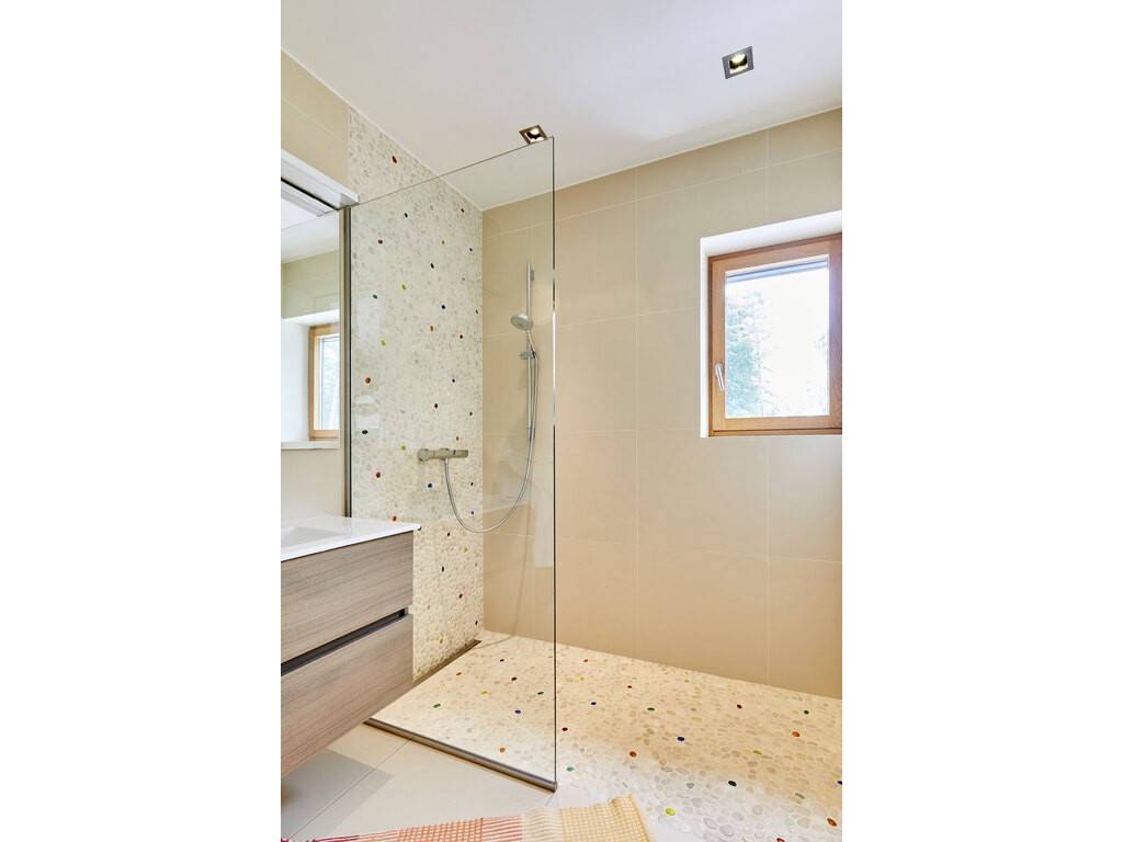 Upstairs, the night hall features a mezzanine overlooking the dining room. Three children's bedrooms, each with its own en-suite bathroom, share a separate WC. A fourth bedroom, with independent access, may also benefit from one of these bathrooms. One of the rooms features a private terrace. The master suite includes a spacious bathroom with shower, bathtub, double vanity, and WC, as well as a walk-through dressing room. A private covered terrace completes the suite.
